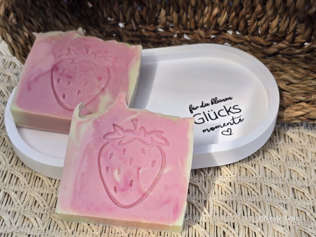Ingredients: Aqua Dest (dest. Wasser), Adeps Suillus (Schweineschmalz), Cocos Nucifeira Seed Oil (Kokosöl), Olea europaea Fruit Oil (Olivenöl), Oryza Sativa Bran Oil (Reiskeimöl), Sodium Hydroxide (NaOH), Carthamus Tinctorius Seed Oil (Färberdistelöl), Citric acid (Zitronensäure), Donkeymilkpowder (Eselsmilchpulver), CI:77891,CI77019, CI77491